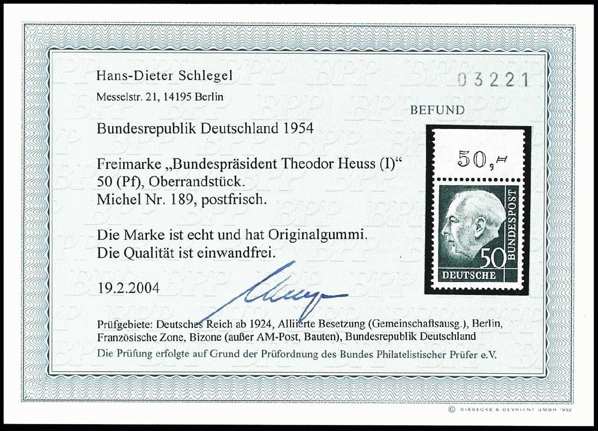 | Zusatzinformationen und Suchstichworte: | Dr. Reinhard Fischer 193. Auktion 21. - 22. Juli 2023 Los 6971 Bundesrepublik Deutschland 50 Pfg. Heuss, Oberrandstück postfrisch, Fotobefund Schlegel BPP: "echt und einwandfrei", Mi. 200,- Ausruf 80,00 EUR |