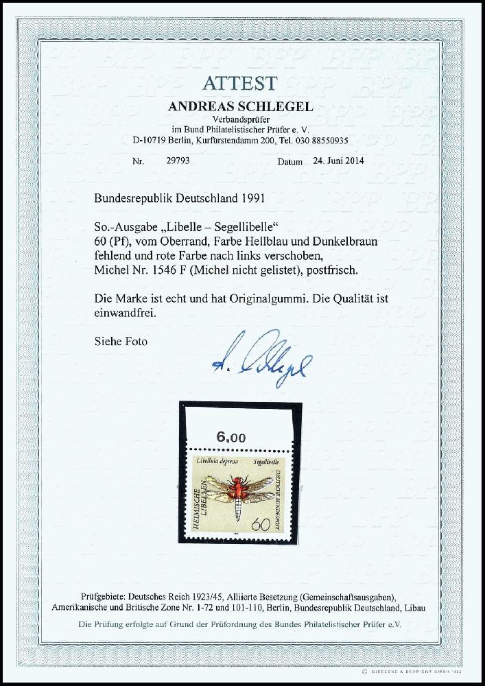 | Zusatzinformationen und Suchstichworte: | Dr. Reinhard Fischer 193. Auktion 21. - 22. Juli 2023 Los 7031 Bundesrepublik Deutschland 1991, 60 Pfennig Libelle postfrisch vom Oberrand mit Abart "Farbe Hellblau und Dunkelbraun fehlend und rote Farbe nach links verschoben". Attest Schlegel vom 14.6.2014 "....echt...und einwandfrei" Ausruf 100,00 EUR |