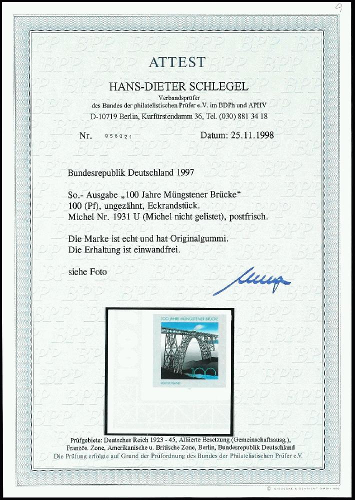 | Zusatzinformationen und Suchstichworte: | Dr. Reinhard Fischer 193. Auktion 21. - 22. Juli 2023 Los 7050 Bundesrepublik Deutschland 100 Pfg. Müngstener Brücke, ungezähnte linke untere Bogenecke, postfrisch, Fotoattest Schlegel BPP: "echt und einwandfrei", Mi. 80,- Ausruf 30,00 EUR |