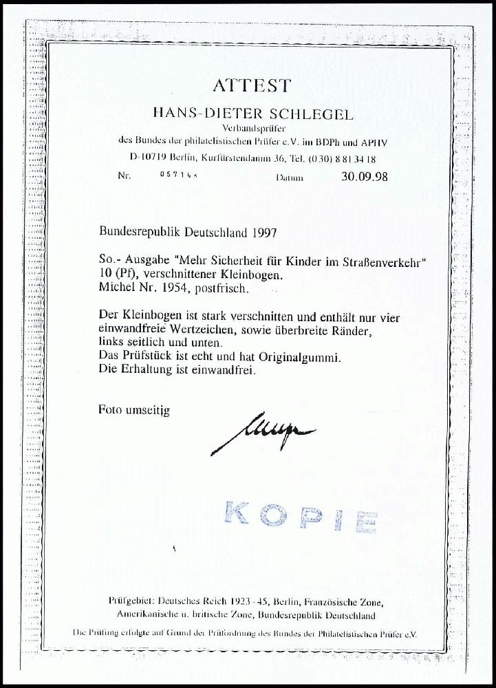 | Zusatzinformationen und Suchstichworte: | Dr. Reinhard Fischer 193. Auktion 21. - 22. Juli 2023 Los 7056 Bundesrepublik Deutschland 10 Pfg. Sicherheit für Kinder, stark verschnittener Kleinbogen mit Leerfelder, postfrisch, Fotoattestkopie Schlegel BPP für Vergleichsstück Ausruf 50,00 EUR |