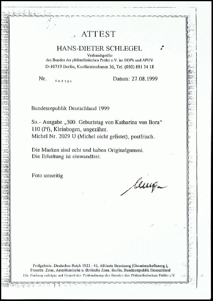 | Zusatzinformationen und Suchstichworte: | Dr. Reinhard Fischer 193. Auktion 21. - 22. Juli 2023 Los 7068 Bundesrepublik Deutschland 110 Pfg. Katharina von Bora, ungezähnt, kpl. Kleinbogen postfrisch, Fotoattestkopie Schlegel BPP für Vergleichsstück Ausruf 150,00 EUR |