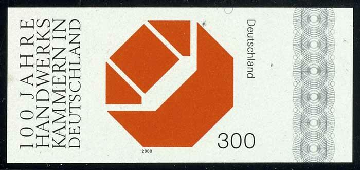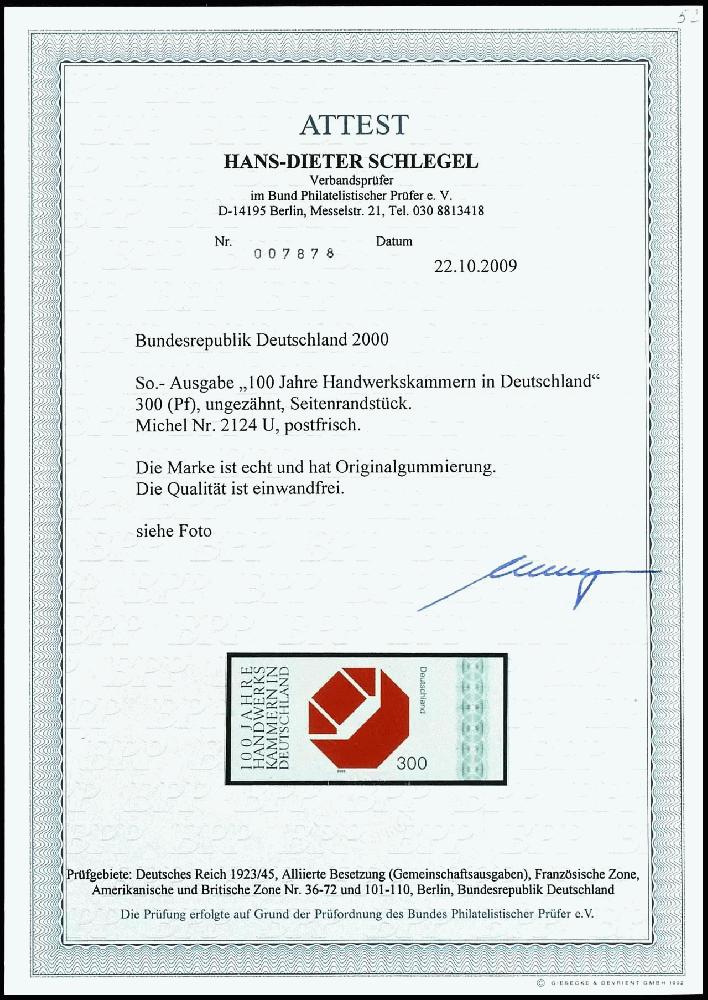 | Zusatzinformationen und Suchstichworte: | Dr. Reinhard Fischer 193. Auktion 21. - 22. Juli 2023 Los 7074 Bundesrepublik Deutschland 2000, 300 Pfg 100 Jahre Handwerkskammern in Deutschland, ungezähnt, Eckrand unten rechts, tadellos postfrisch, Fotoattest H.-D. Schlegel BPP: "Die Qualität ist einwandfrei." Ausruf 50,00 EUR |