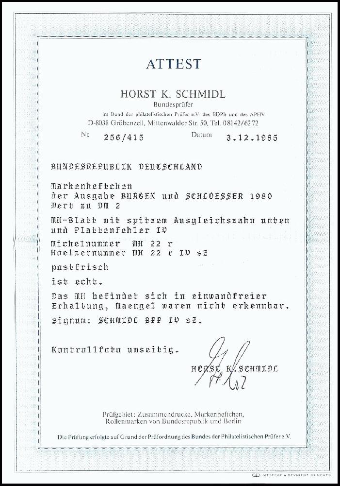 | Zusatzinformationen und Suchstichworte: | Dr. Reinhard Fischer 193. Auktion 21. - 22. Juli 2023 Los 7113 Bundesrepublik Deutschland Burgen & Schlösser, 2 Mark Markenheftchen, MiNr. 22 r, Plattenfehler IV, spitzer Zahn unten, Fotoattest Schmidl BPP "postfrisch, ..in einwandfreier Erhaltung" Ausruf 50,00 EUR |