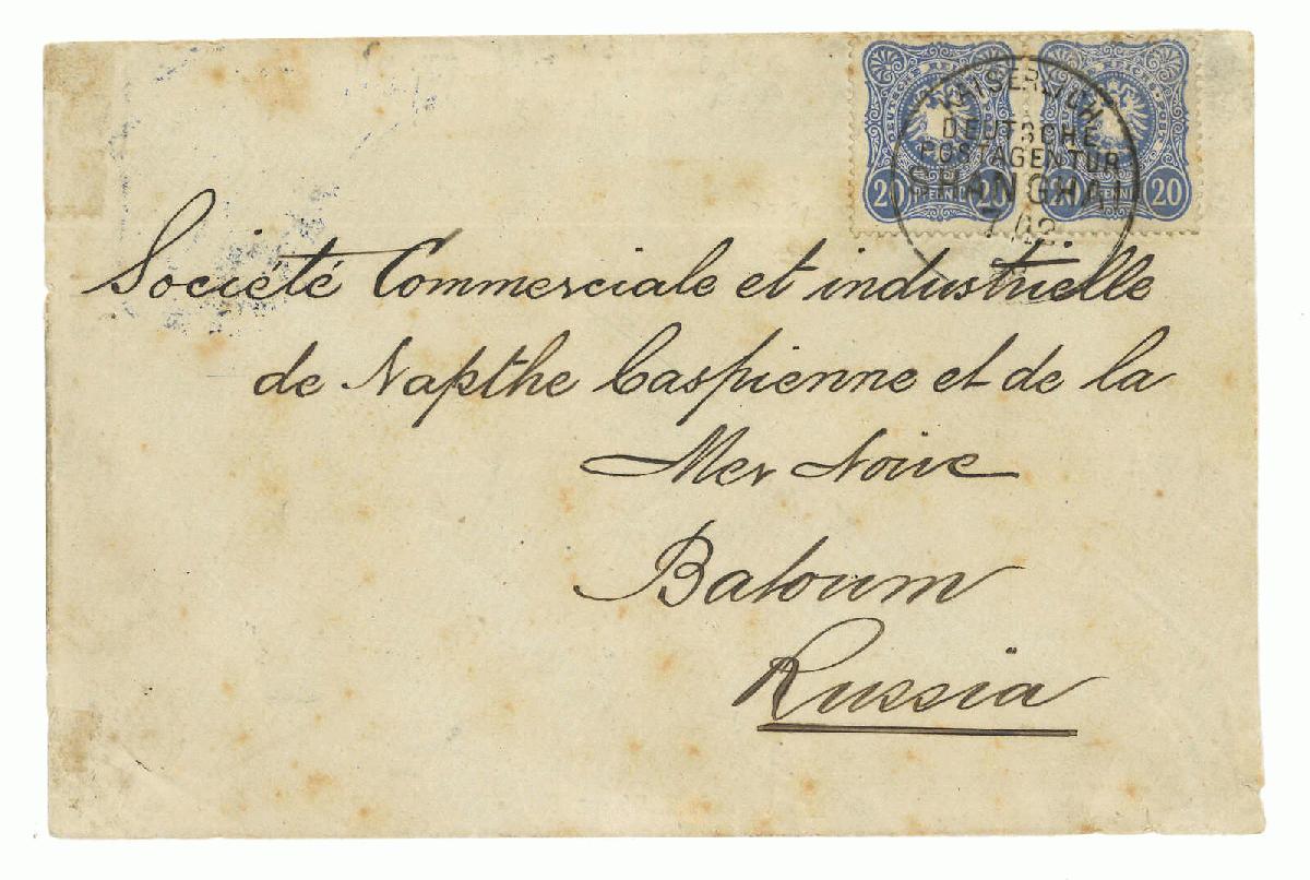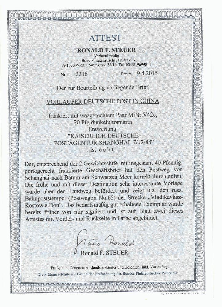 | Zusatzinformationen und Suchstichworte: | Ava Auctions 4. Auktion 08.-10. Juli 2023 Los 1739 China Deutsche Post 1888. Hankow to Batum, Russia. Double rate commercial cover originated from Hankow, put to theGerman Post in Shanghai (7 Dec), transported trans-Siberia via Troitskosavsk, Postwagon No. 65(on the Vladikavkaz Rostov-on-Don route; 6 Mar) to Batum (10 Mar). Steuer Certificate 2015. Ausruf 5.000,00 HKD |