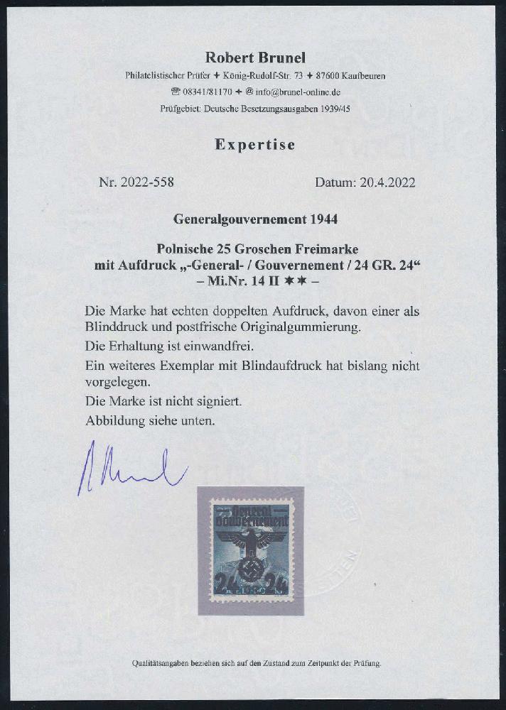 | Zusatzinformationen und Suchstichworte: | HBA 81. Auktion 11. - 13. Mai 2023 Los 1310 (D) Generalgouvernement 1940, Freimarke, 24 Gr. a. 25 Gr., schwärzlichgrünlichblau, Urmarke Type II, mit doppeltem Aufdruck, davon einer im Blinddruck, tadellos postfrisches Kabinettstück, laut Attest hat ein weiteres Exemplar bisher nicht vorgelegen, ohne Signaturen und gepr. Brunel mit aktuellem Fotoattest, Mi. nicht gelistet. Zuschlag 360,00 EUR |