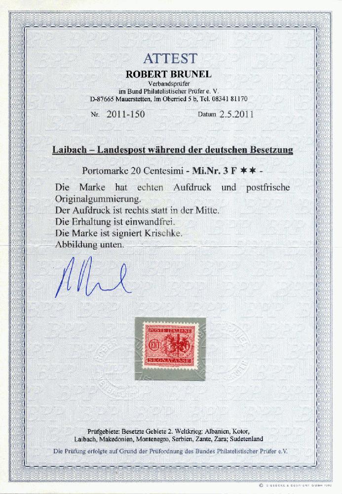 | Zusatzinformationen und Suchstichworte: | 80. Viennafil Live-Auktion 30. Mai - 1. Juni 2023 Los 2430 Deutsche Besetzung II. WK Laibach 1944, Portomarke 20 c mit Aufdruck rechts statt in der Mitte, postfrisch, signiert Krischke, Attest Brunel, Mi. 3F / 700,- Zuschlag 210,00 EUR |