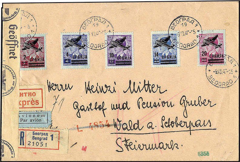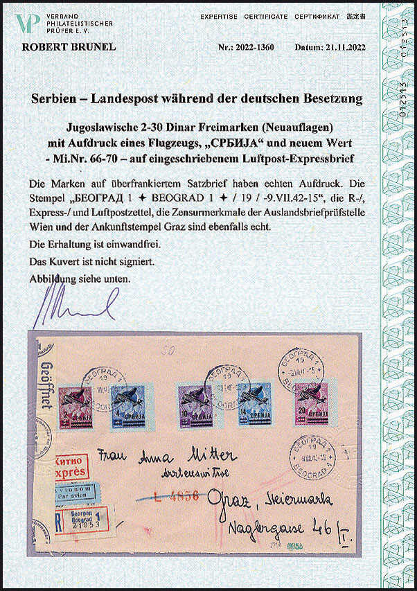 | Zusatzinformationen und Suchstichworte: | Götz 402. Auktion 19. - 23. Juni 2023 Los 3988 Deutsche Besetzung II. WK Serbien Flugpost 1942 auf R-Luftpost-Expressbrief von "Beograd 9.VII.42" nach Graz mit entsprechender Zensur u. Ankunftsstempel. Echt gelaufene Belege dieser Ausgabe sehr selten! Entsprechendes Attest Brunel Zuschlag 180,00 EUR |