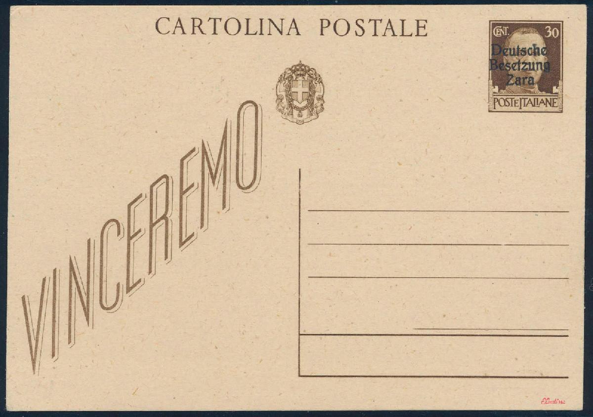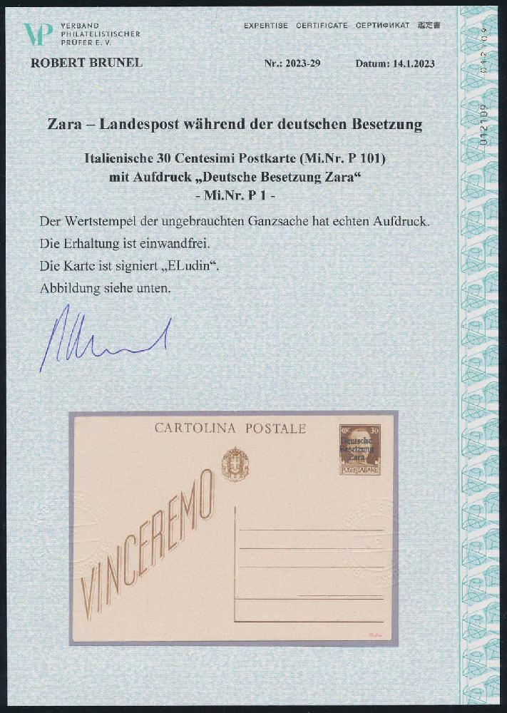 | Zusatzinformationen und Suchstichworte: | HBA 81. Auktion 11. - 13. Mai 2023 Los 1428 (D) Deutsche Besetzung II. WK Zara 1943, Ganzsachenkarte, 30 C., braun a. sämisch, sehr sauber ungebrauchtes Kabinettstück (links oben winzige Eckbugspur, im Attest nicht erwähnt), sehr selten, gepr. Ludin und gepr. Brunel mit neuem Fotoattest, Mi. 1100,-- Zuschlag 340,00 EUR |