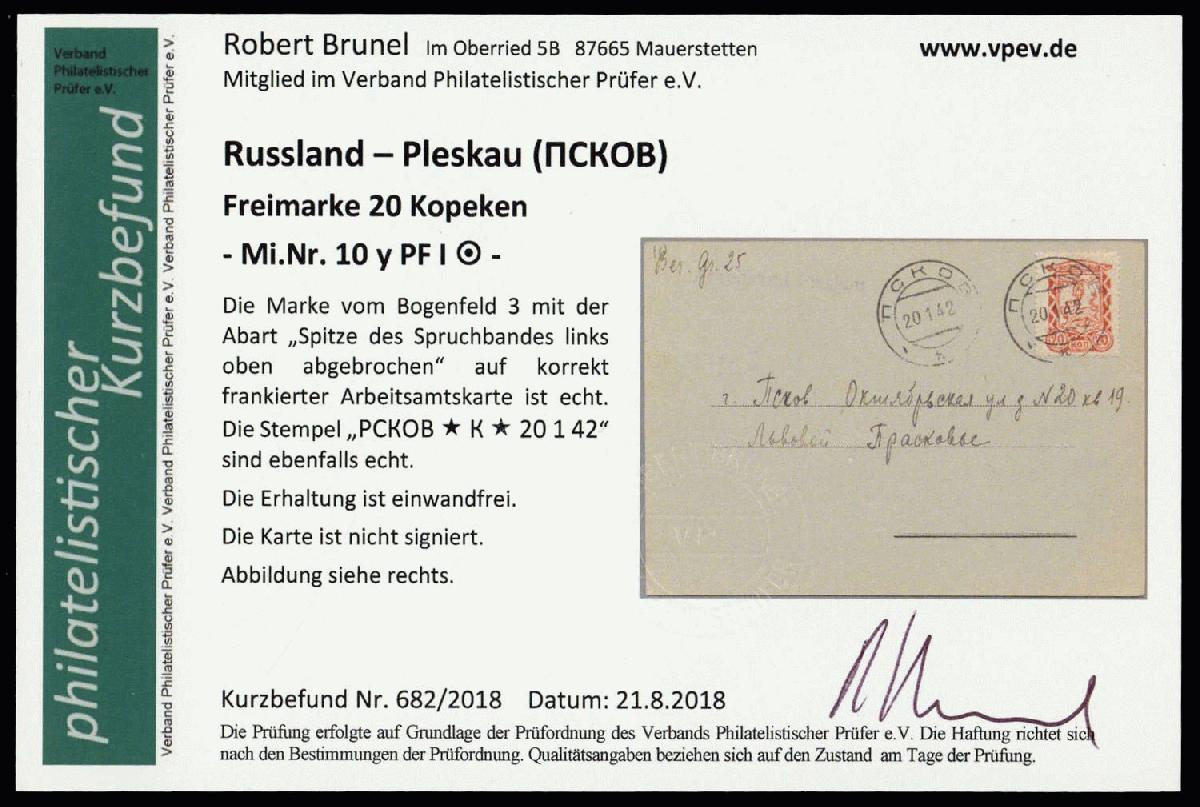 | Zusatzinformationen und Suchstichworte: | 76. Badische Briefmarken GmbH Auktion 27. Juni 2023 Los 7041 D Deutsche Besetzung II. WK Russland - Pleskau 1941, 20 K. Wappen mit Plattenfehler "Spitze gebrochen" auf Karte des Arbeitsamtes von Pleskau 20.1.42, Kurzbefund Brunel "echt und einwandfrei" (ME 200,-) GEBOT |