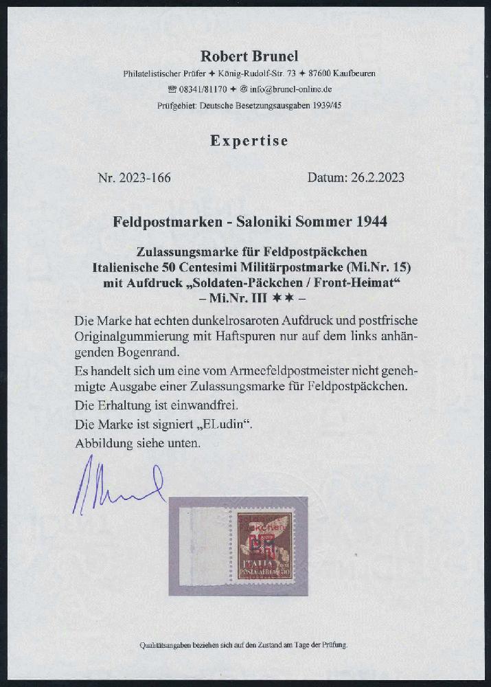 | Zusatzinformationen und Suchstichworte: | HBA 81. Auktion 11. - 13. Mai 2023 Los 1453 (D) Deutsche Besetzung II. WK, Feldpostmarken 1944, Saloniki-Päckchenmarke, 50 C., schwarzsiena, ohne milchigweißem Unterdruck, tadellos postfrisches Kabinettstück vom linken Bogenrand (dort Haftspuren), gepr. Ludin mit Fotoattest und gepr. Brunel mit neuem Fotoattest, Mi. 2000,-- Zuschlag 1.650,00 EUR |
