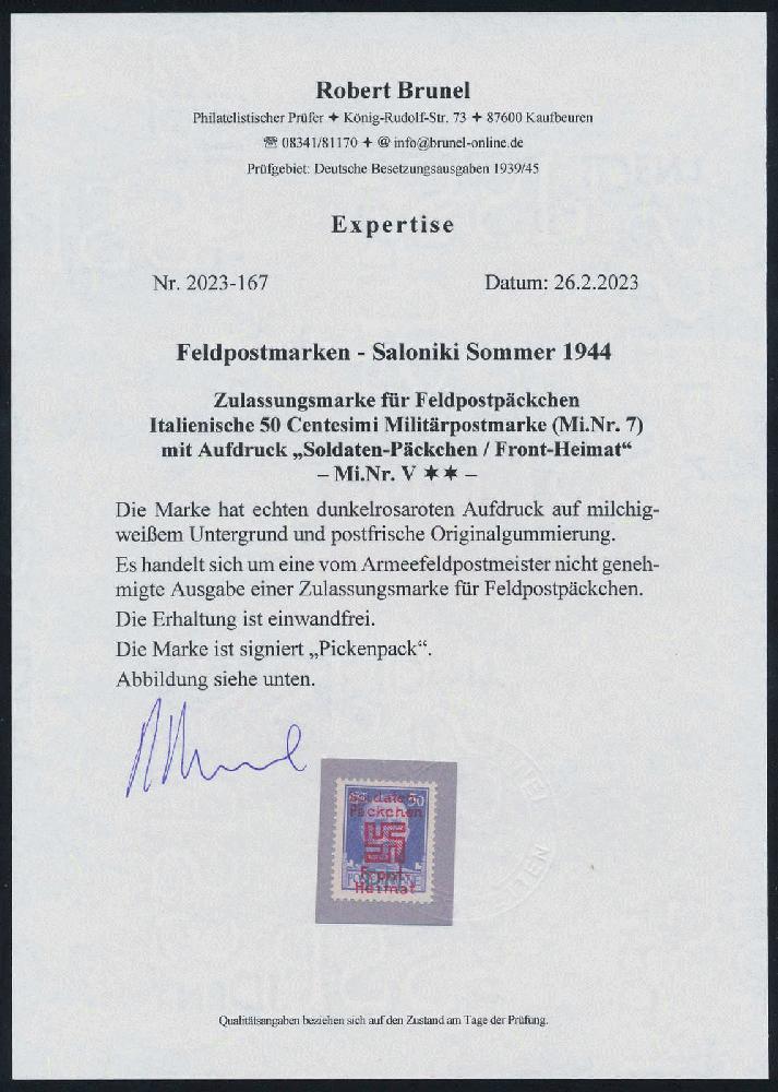 | Zusatzinformationen und Suchstichworte: | HBA 81. Auktion 11. - 13. Mai 2023 Los 1454 (D) Deutsche Besetzung II. WK, Feldpostmarken 1944, Saloniki-Päckchenmarke, 50 C., hellviolett, mit milchigweißem Unterdruck, tadellos postfrisches Kabinettstück, Altsign. und gepr. Brunel mit neuem Fotoattest, Mi. 1200,--. Zuschlag 270,00 EUR |