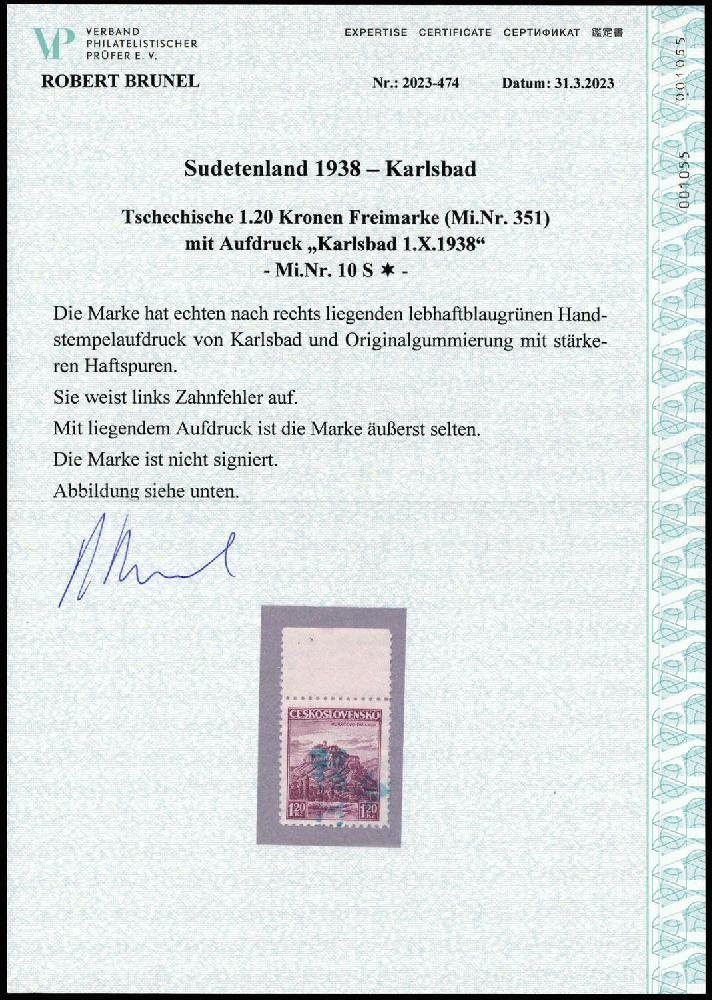 | Zusatzinformationen und Suchstichworte: | 76. Badische Briefmarken GmbH Auktion 27. Juni 2023 Los 6735 D Sudetenland Karlsbad 1938, 1.20 Kronen Freimarke mit echtem senkrechtem Sudetenland Karlsbad- Überdruck auf einer tschechischen Freimarke in ungebrauchter Erhaltung mit Zahnfehler. Aktuelles Farbfotoattest Robert Brunel / Kaufbeuren vom 31.3.2023 "... echt .... Mit liegendem Aufdruck ist die Marke äußerst selten ...." (ME 1.200.-) GEBOT |