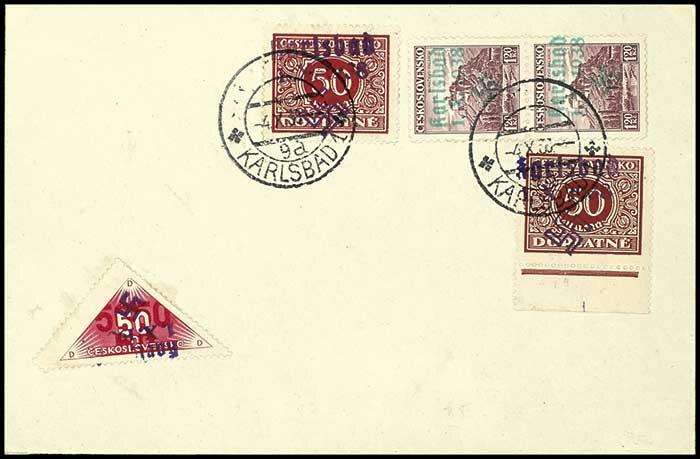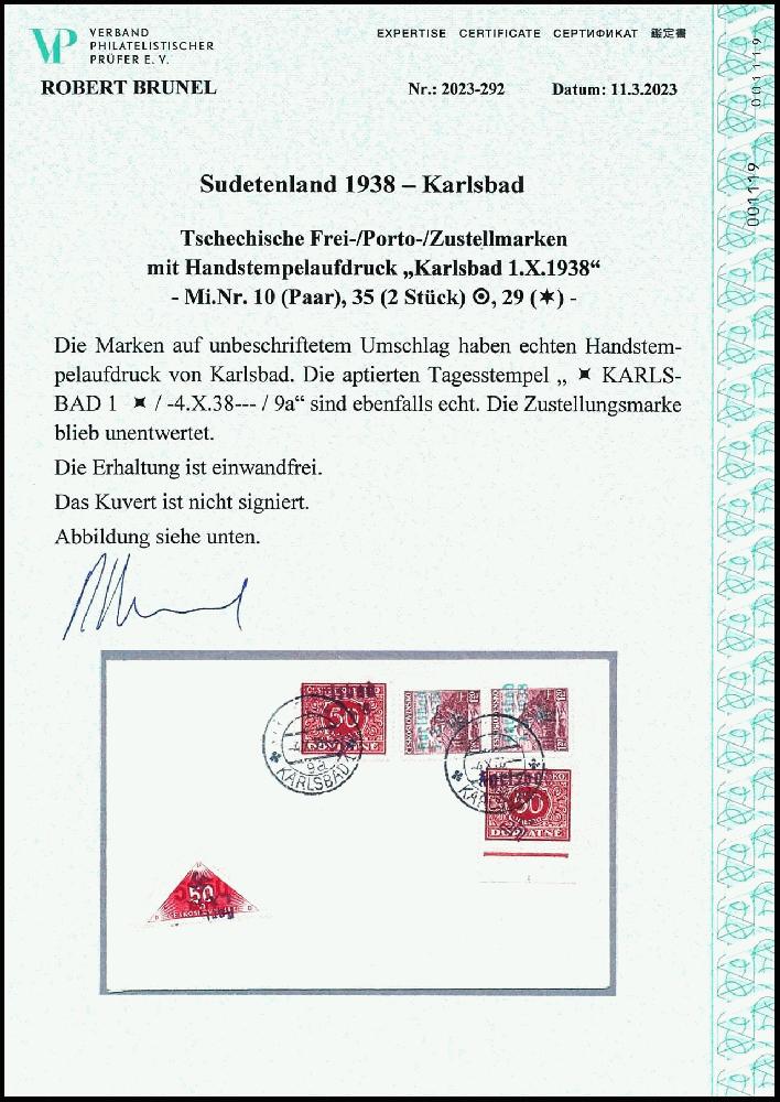 | Zusatzinformationen und Suchstichworte: | Dr. Reinhard Fischer 192. Auktion 19. - 20. Mai 2023 Los 1675 Sudetenland Karlsbad 1,20 Kronen mit Handstempelaufdruck "Karlsbad 1.X.1938 + Hakenkreuz", senkrechtes Paar auf Blankoumschlag mit 50 Heller Portomarken mit Handstempel-Aufdruck "Karlsbad 1. X. 1938 + Hakenkreuz" mit Entwertung "Karlsbad 1 4.X.38" auf Blankoumschlag mit nebengeklebter und nicht entwerteter Dreiecksmarke zu 50 Heller mit Aufdruck "Karlsbad 1.X. 1938 + Hakenkreuz", Expertise Robert Brunel VP (2023): "Die Erhaltung ist einwandfrei.", Mi. 280.- (Mi.-Nr. 29 nicht berechnet) Ausruf 120,00 EUR |