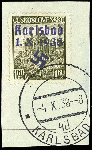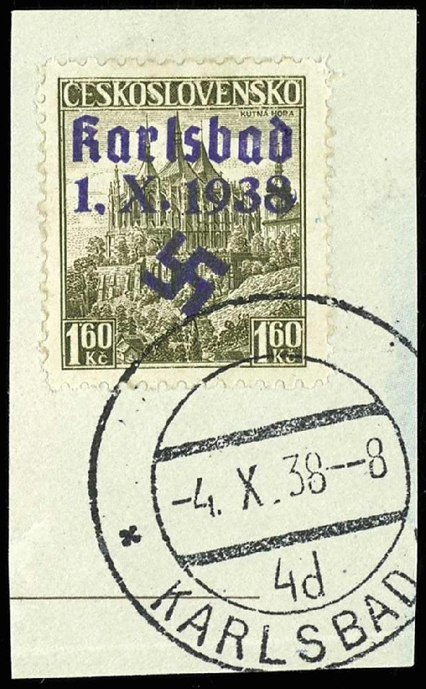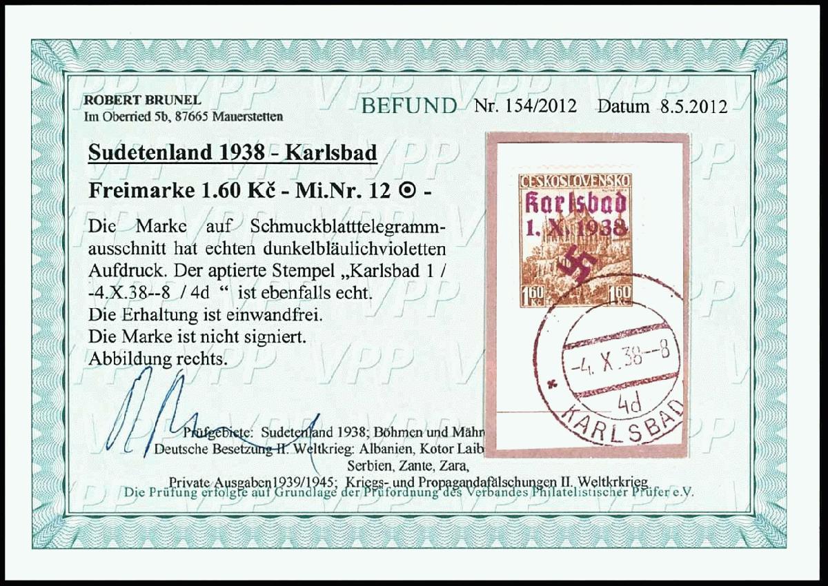 | Zusatzinformationen und Suchstichworte: | Dr. Reinhard Fischer 192. Auktion 19. - 20. Mai 2023 Los 1676 Sudetenland Karlsbad 1,60 Kc. Freimarke mit Handstempel-Aufdruck "1. X. 1938 + Hakenkreuz", tadellos gestempelt "Karlsbad 1 4.X.38" auf Briefstück, Auflage nur 305 Exemplare, Fotobefund Brunel VP (2012): "Die Erhaltung ist einwandfrei", Mi. 110.- Ausruf 50,00 EUR |