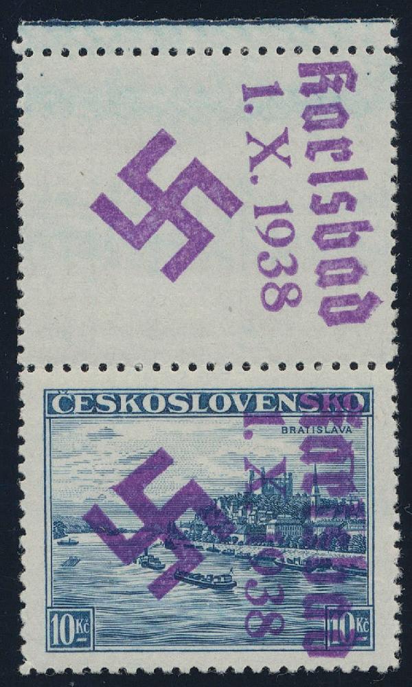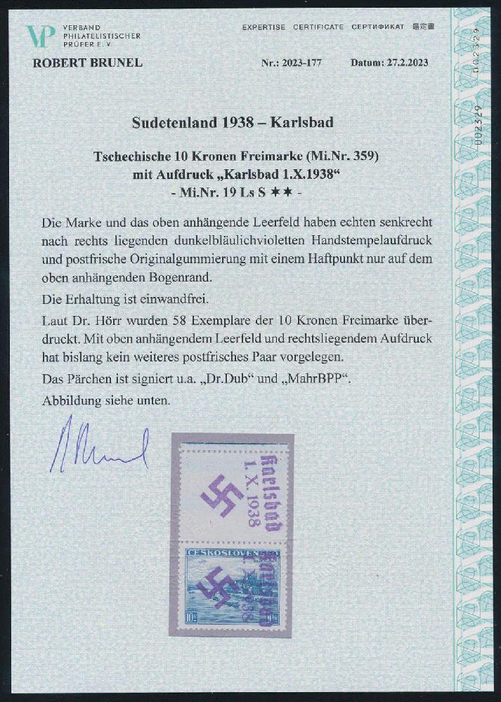 | Zusatzinformationen und Suchstichworte: | HBA 81. Auktion 11. - 13. Mai 2023 Los 1254 (D) Sudetenland Karlsbad 1938, Freimarke Landschaften, 10 Kc., schwarzkobaltblau, oben mit Leerfeld und Bogenrand, Marke und Leerfeld mit senkrecht nach rechts liegendem Aufdruck überdruckt, tadellos postfrisches Kabinettstück, auch das Leerfeld postfrisch und ungefaltet, im oberen Bogenrand ein winziger Haftpunkt, hier ohne Bedeutung, äußerst seltenes Stück, es ist kein weiteres postfrisches Paar bekannt! Altsign. und gepr. Brunel mit neuem Fotoattest, Mi. ohne Preis, Herr Brunel hat einen Katalogwert von 5000,-- für die Prüfung zugrunde gelegt. Zuschlag 4.100,00 EUR |