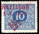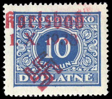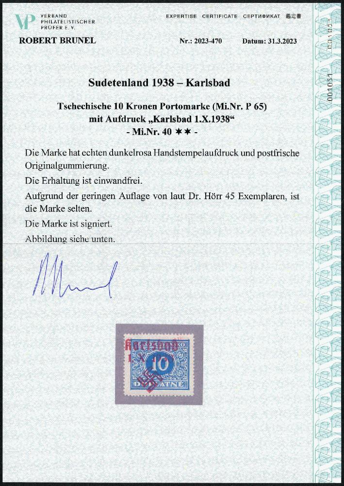 | Zusatzinformationen und Suchstichworte: | 7. Großposten-Auktion Deutsche Briefmarken AG 13. Juni 2023 Los 294 D Sudetenland Karlsbad 1938, 10 Kronen Portomarke mit echtem Sudetenland Karlsbad- Überdruck auf einer tschechischen Portomarke in postfrischer Luxuserhaltung. Signiert und aktuelles Farbfotoattest Robert Brunel / Kaufbeuren vom 31.3.2023 "... echt und einwandfrei .....". Die Auflage betrug nur 45 Exemplare! Zuschlag 1.200,00 EUR |