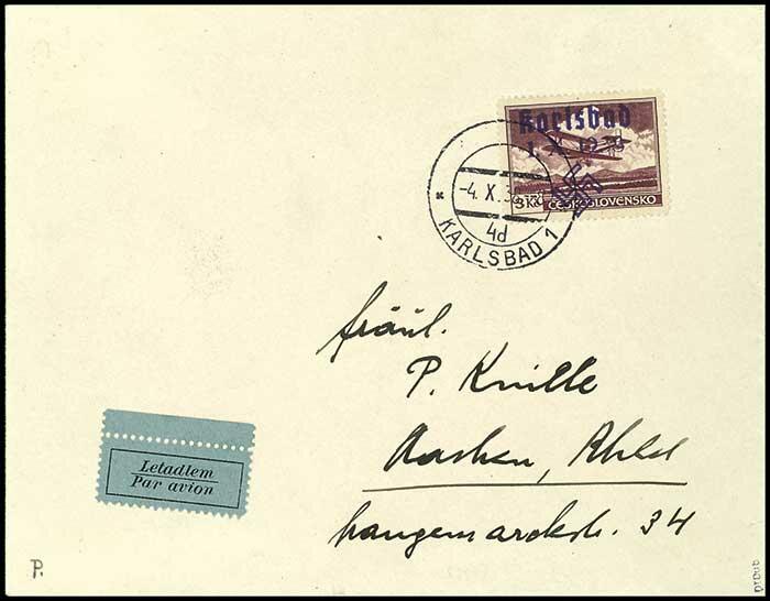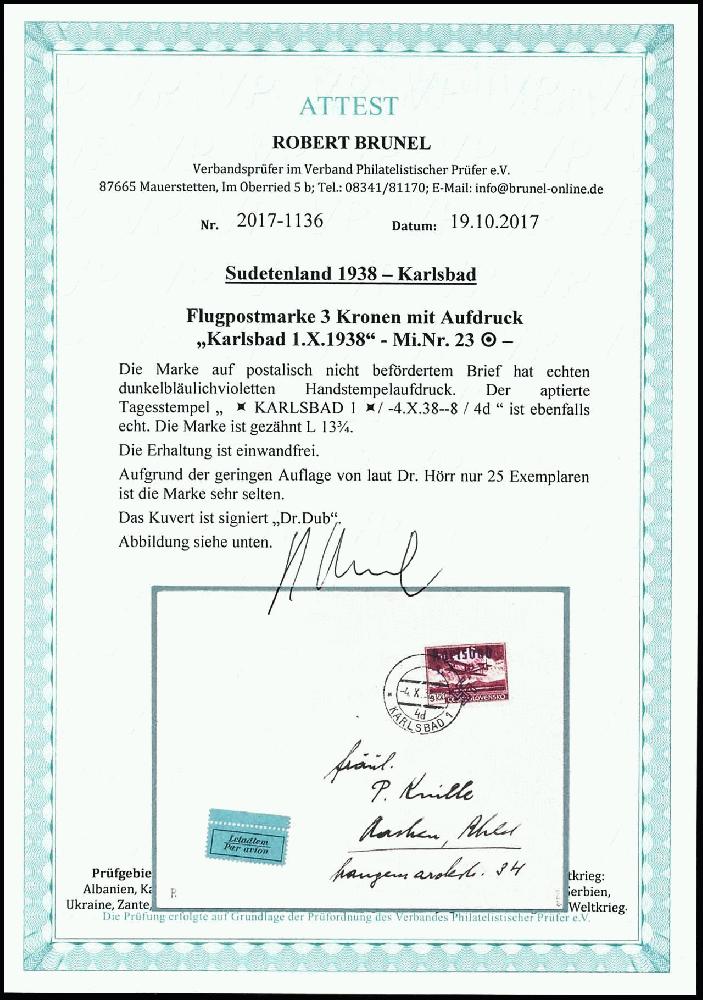 | Zusatzinformationen und Suchstichworte: | Dr. Reinhard Fischer 192. Auktion 19. - 20. Mai 2023 Los 1678 Sudetenland Karlsbad 3 Kc. Flugpostmarke mit Handstempel-Aufdruck "Karlsbad 1.X.1938 + Hakenkreuz", tadellos gestempelt "x Karlsbad 1 x 4d -4.X.38" auf nachbeschriftetem Umschlag, postalisch nicht befördert, Auflage nur 25 Exemplare - eine der großen Raritäten der Sudetenland-Philatelie, Fotoattest Brunel VP: "Die Erhaltung ist einwandfrei." Zuschlag 750,00 EUR |