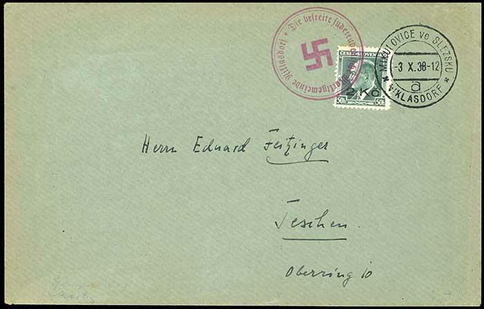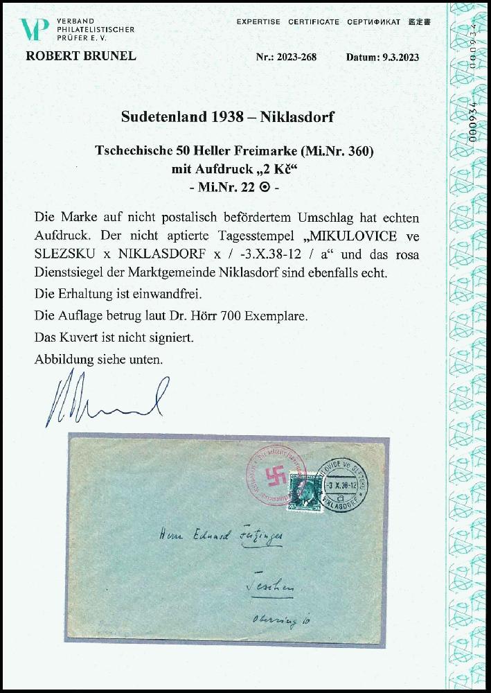 | Zusatzinformationen und Suchstichworte: | Dr. Reinhard Fischer 192. Auktion 19. - 20. Mai 2023 Los 1692 Sudetenland Niklasdorf 2 Kc. auf 50 Heller Freimarke, entwertet "Niklasdorf 30.IX.38" sowie mit rosanem Dienstsiegel der Marktgemeinde Niklasdorf auf postalisch nicht befördertem Kuvert, die Auflage dieser Marke beträgt nur 700 Exemplare, Expertise Robert Brunel VP (2023): "Die Erhaltung ist einwandfrei.", Mi. 500.- Zuschlag 460,00 EUR |