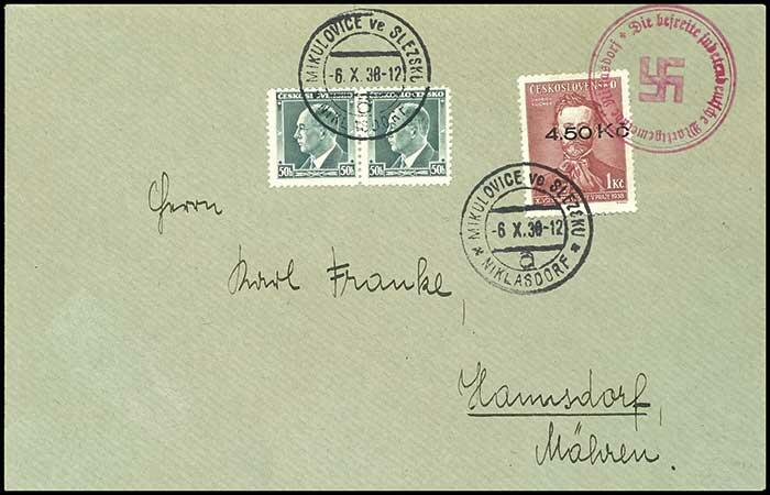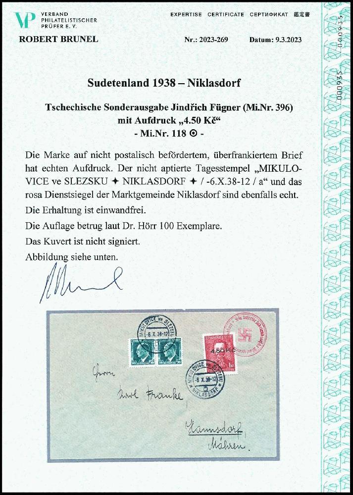 | Zusatzinformationen und Suchstichworte: | Dr. Reinhard Fischer 192. Auktion 19. - 20. Mai 2023 Los 1695 Sudetenland Niklasdorf 4,50 Kc. auf 1 Kc. "Fügner", entwertet "Niklasdorf 6.X.38" sowie mit rosanem Dienstsiegel der Marktgemeinde Niklasdorf auf postalisch nicht befördertem Umschlag, die Auflage dieser Marke beträgt nur 100 Exemplare, Expertise Robert Brunel VP (2023): "Die Erhaltung ist einwandfrei.", Mi. 1.000.- Zuschlag 550,00 EUR |