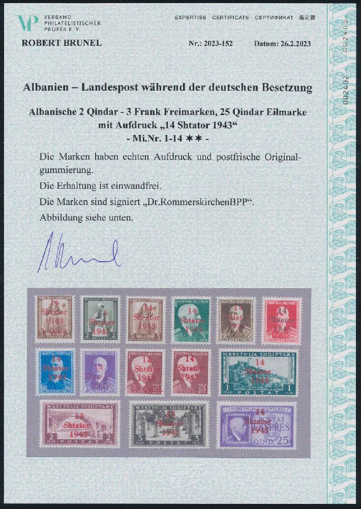 | Zusatzinformationen und Suchstichworte: | HBA 81. Auktion 11. - 13. Mai 2023 Los 1263 (D) Deutsche Besetzung II. WK Albanien 1943, Freimarken mit Aufdruck, 14 W. kpl., tadellos postfrischer Kabinettsatz, Altsign. und gepr. Brunel mit neuem Fotoattest, Mi. 500,-- Zuschlag 150,00 EUR |