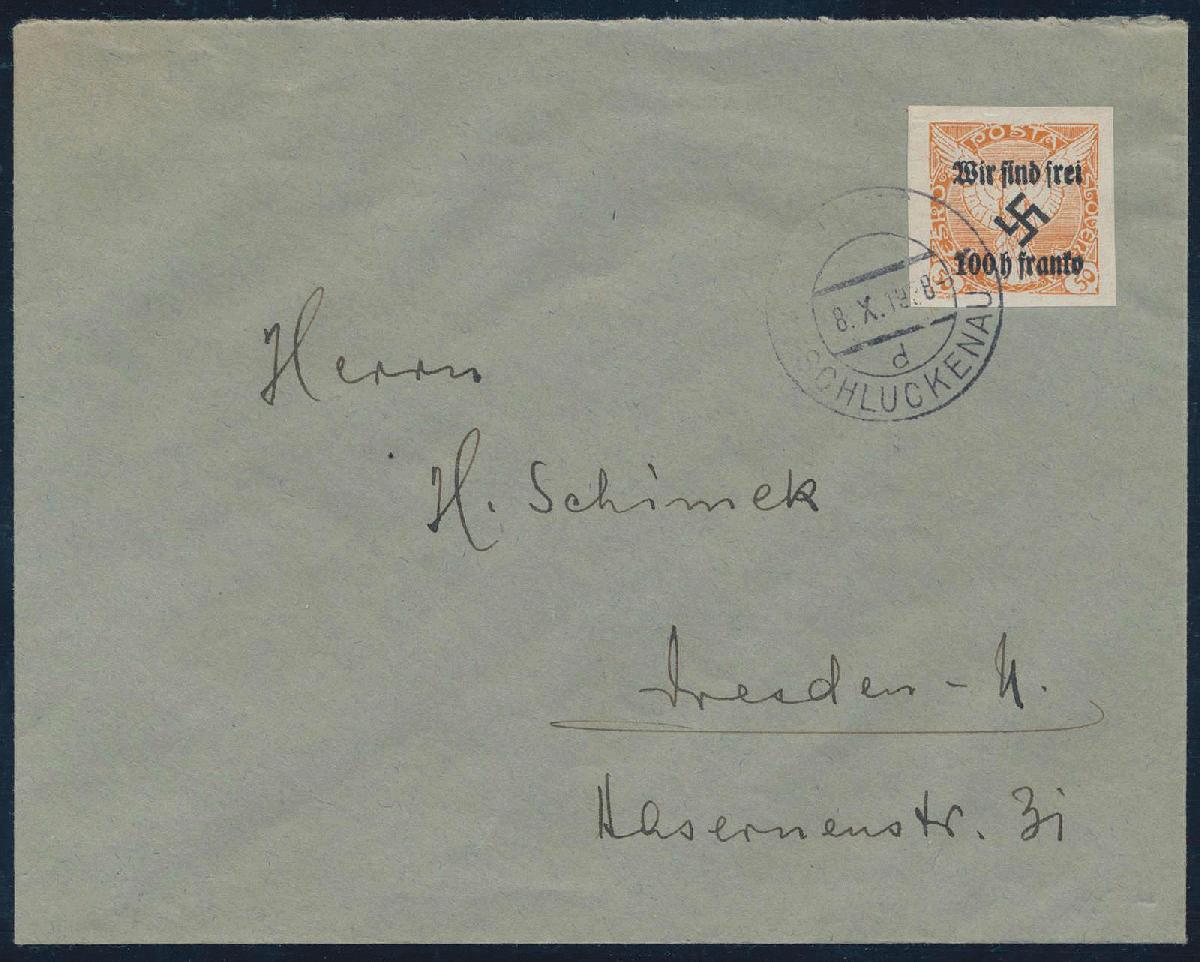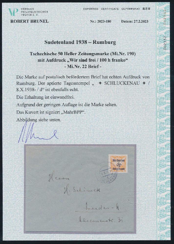 | Zusatzinformationen und Suchstichworte: | HBA 81. Auktion 11. - 13. Mai 2023 Los 1260 (D) Sudetenland Rumburg 1938, Zeitungsmarke mit Aufdruck, 100 H. a. 50 H., orange, als Einzelfrankatur auf befördertem Brief von "SCHLUCKENAU d 8.X.1938", adressiert nach Dresden, tadellose Kabinetterhaltung, gepr. Mahr und gepr. Brunel mit neuem Fotoattest, Mi. 1200,--. Zuschlag 300,00 EUR |