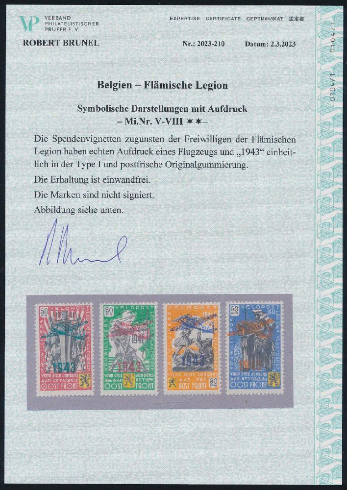 | Zusatzinformationen und Suchstichworte: | HBA 81. Auktion 11. - 13. Mai 2023 Los 1266 (D) Deutsche Besetzung II. WK Belgien Flämische Legion 1943, Symbolische Darstellungen mit Flugzeug-Aufdruck, 4 W. kpl., tadellos postfrischer Kabinettsatz, ohne Signaturen und gepr. Brunel mit neuem Fotoattest, Mi. 450,-- Zuschlag 200,00 EUR |