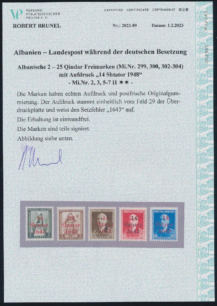 | Zusatzinformationen und Suchstichworte: | HBA 81. Auktion 11. - 13. Mai 2023 Los 1264 (D) Deutsche Besetzung II. WK Albanien 1943, Freimarken mit Aufdruck, 5 W. aus dem Satz, je mit seltenem Aufdruckfehler "1643" statt "1943", je tadellos postfrisches Kabinettstück, drei Marken mit Altsign. und gepr. Brunel mit neuem Fotoattest, Mi. 2250,-- Zuschlag 540,00 EUR |