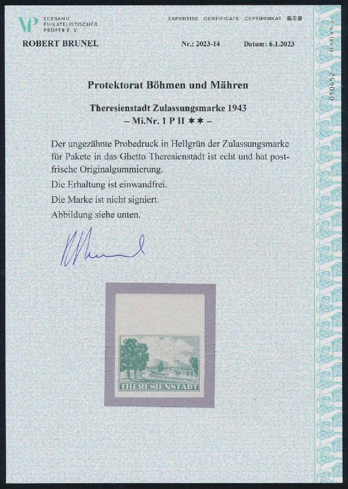 | Zusatzinformationen und Suchstichworte: | HBA 81. Auktion 11. - 13. Mai 2023 Los 1281 (D) Böhmen und Mähren Theresienstadt 1943, Theresienstadt-Zulassungsmarke, ungezähnter Probedruck in Hellgrün, tadellos postfrisches Kabinettstück vom Oberrand (dort kleiner Haftpunkt), ohne Signaturen und gepr. Brunel mit neuem Fotoattest, Mi. 900,-- Zuschlag 1.250,00 EUR |