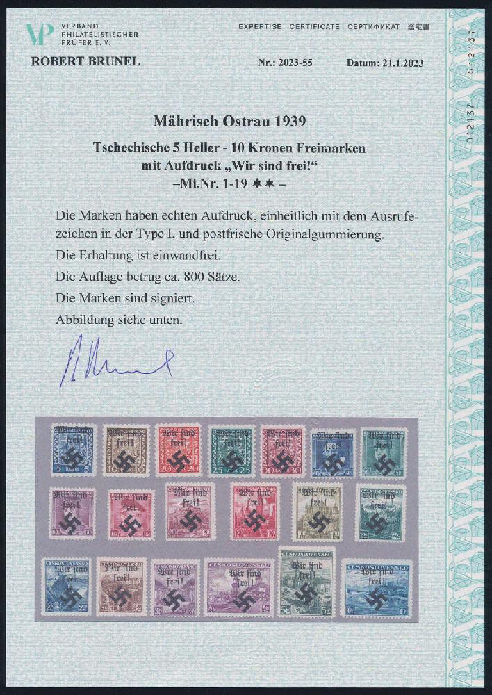 | Zusatzinformationen und Suchstichworte: | HBA 81. Auktion 11. - 13. Mai 2023 Los 1284 (D) Böhmen und Mähren Mährisch-Ostrau 1939, Freimarken mit Aufdruck, 19 W. kpl., einheitlich Ausrufezeichen in Type I, tadellos postfrischer Kabinettsatz, Altsign. und gepr. Brunel mit neuem Fotoattest, Mi. 870,-- Zuschlag 400,00 EUR |