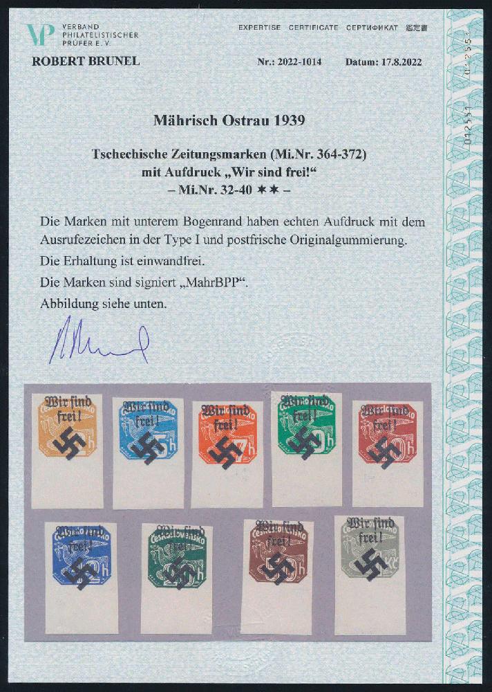 | Zusatzinformationen und Suchstichworte: | HBA 81. Auktion 11. - 13. Mai 2023 Los 1290 (D) Böhmen und Mähren Mährisch-Ostrau 1939, Zeitungsmarken mit Aufdruck in Type I, 9 W. kpl., einheitlich vom Unterrand, tadellos postfrischer Kabinettsatz, sehr frisch, jede Marke gepr. Mahr und gepr. Brunel mit neuem Fotoattest, Mi. 480,-- Zuschlag 210,00 EUR |