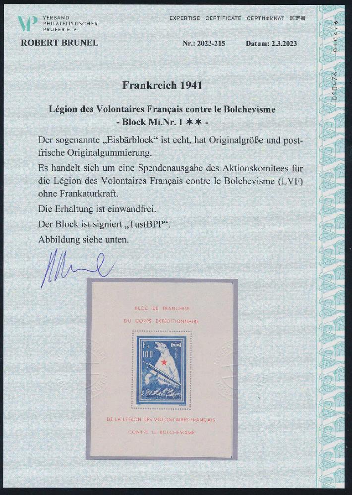 | Zusatzinformationen und Suchstichworte: | HBA 81. Auktion 11. - 13. Mai 2023 Los 1305 (D) Deutsche Besetzung II. WK Französische Legion 1941, Eisbärblock, tadellos postfrischer Kabinettblock, gepr. Tust und gepr. Brunel mit neuem Fotoattest, Mi. 800,-- Zuschlag 240,00 EUR |