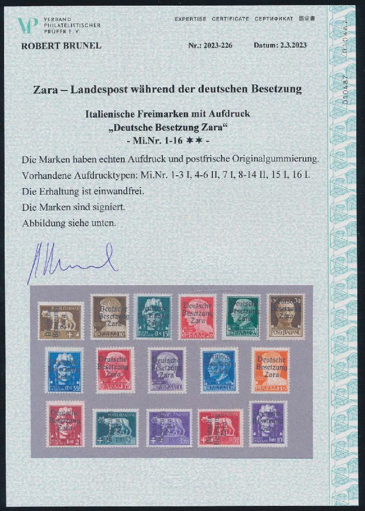 | Zusatzinformationen und Suchstichworte: | HBA 81. Auktion 11. - 13. Mai 2023 Los 1409 (D) Deutsche Besetzung II. WK Zara 1943, Freimarken mit Aufdruck, 5 C. bis 10 Lire, 16 W. kpl., tadellos postfrischer Kabinettsatz, Aufdrucktypen I oder II, verschiedene Altsign.m eist Ludin und gepr. Brunel mit neuem Fotoattest, Mi. 6283,-- Zuschlag 2.400,00 EUR |