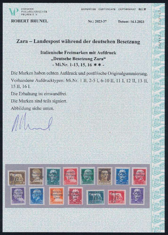 | Zusatzinformationen und Suchstichworte: | HBA 81. Auktion 11. - 13. Mai 2023 Los 1411 (D) Deutsche Besetzung II. WK Zara 1943, Freimarken mit Aufdruck, 15 W., Aufdruck in Type I oder II, tadellos postfrischer Kabinettsatz, meist Altsign. und gepr. Brunel mit neuem Fotoattest, Mi. 3683,-- Zuschlag 900,00 EUR |