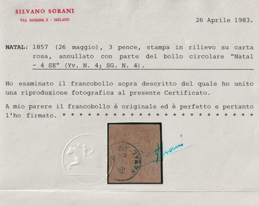 | Zusatzinformationen und Suchstichworte: | 182. Laser Invest Auktion - Live Auktion 16. Juni 2023 Los 340 Natal 1857 geprägt. 3 p. (S. G. 4), gestempelt "Natal 4 SE. "Prüfbefund. Sorani Ausruf 150,00 EUR |