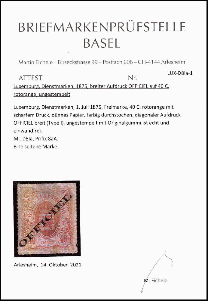 | Zusatzinformationen und Suchstichworte: | Württembergisches Auktionshaus 142. Versteigerung 23.-24. Juni 2023 Los 914 + Luxemburg 40 C. rotorange, ungebr. Kabinettstück, Fotoattest Eichele (Prifix 8aA). Katalogpreis: 2.200,- Ausruf 400,00 EUR |