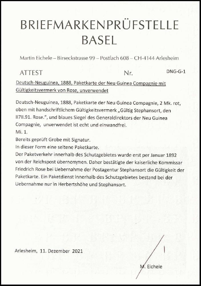 | Zusatzinformationen und Suchstichworte: | Württembergisches Auktionshaus 142. Versteigerung 23.-24. Juni 2023 Los 5883 Deutsche Kolonien Neuguinea, Vorläufer 1888, Paketkarte der Neu-Guinea-Compagnie mit hs. amtlichem Gültigkeitsvermerk "gültig Stephansort, den 11/11 91" nebst Unterschrift des Generaldirektors der Neu-Guinea-Compagnie und zusätzl. blauem Siegelstempel. Eine sehr seltene und postgeschichtlich interessante Karte, sign. Grobe, Fotoattest Eichele Zuschlag 640,00 EUR |