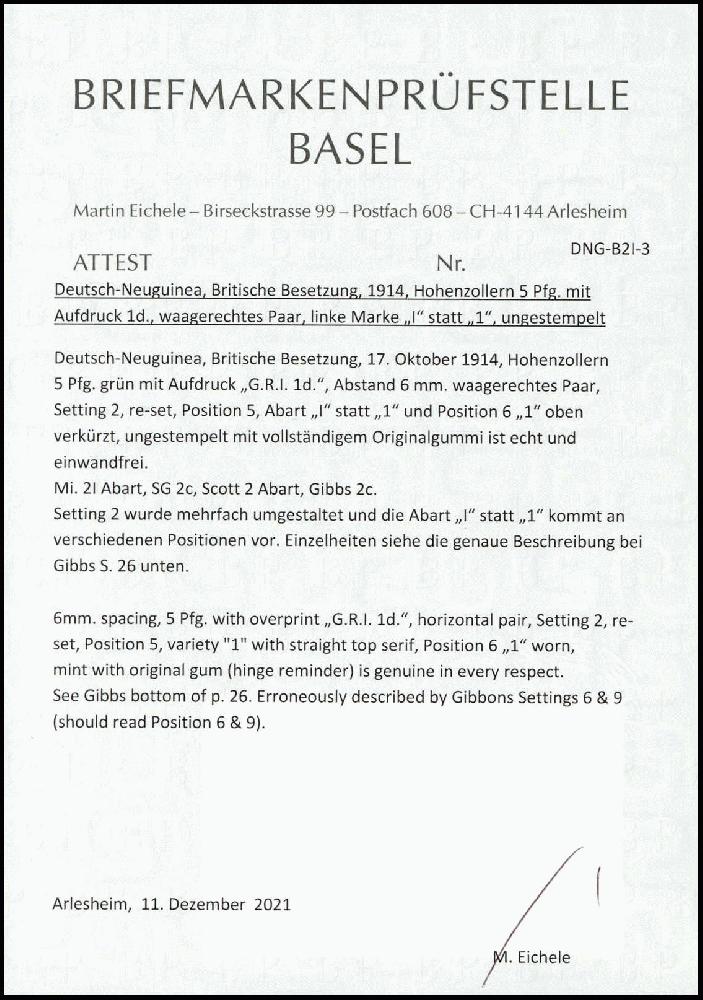 | Prüfgebiet: | Deutsche Kolonien Deutsch-Neuguinea Britische Besetzung |