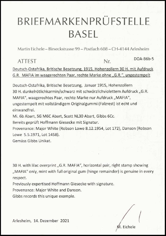 | Zusatzinformationen und Suchstichworte: | Württembergisches Auktionshaus 142. Versteigerung 23.-24. Juni 2023 Los 6149 Deutsche Kolonien Ostafrika Brit. Besetzung Fehlaufdruck nur "MAFIA": 30 H., Aufdruck schwärzlichviolett, die rechte Marke mit Aufdruckfehler: fehlende Buchstaben "G.R.", li. Marke mit normalem Aufdruck, tadellos ungebraucht in perfekter Zähnung und Zentrierung sowie mit vollständigem Originalgummi. Eine der bemerkenswertesten Aufdruck-Abarten der Besetzungsausgaben Deutsch-Ostafrikas. Bei Stanley Gibbons ist ledigl. ein Paar mit und ohne Aufdruck katalogisiert, im Handbuch Robert Gibbs hingegen ist das hier angebotene Paar unter Nr.6Cc aufgeführt. Es handelt sich um ein Unikat. Ex Sammlung Major White (Robson Lowe 8.12.1954, Los 172) sowie Slg. Danson (Robson Lowe 5.5.1971, Los 1458), sign. Hoffmann-Giesecke, Fotoattest Eichele (SG M6C var, Gibbs 6Cc als Unikat) Ausruf 7.000,00 EUR |