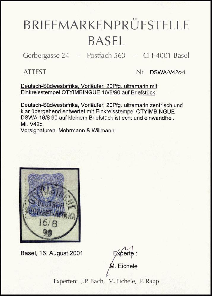 | Zusatzinformationen und Suchstichworte: | Württembergisches Auktionshaus 142. Versteigerung 23.-24. Juni 2023 Los 6302 Deutsche Kolonien Südwestafrika Otyimbingue 20 Pfg., tadelloses Bfstk. mit vollem Stempel OTYIMBINGUE DSWA 16/8 90. So schön selten, sign. Willmann, Mohrmann, Attest Eichele. Katalogpreis: 700,-+ Zuschlag 410,00 EUR |