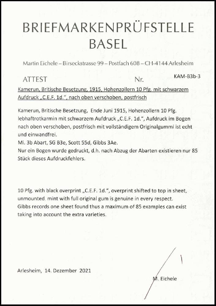 | Zusatzinformationen und Suchstichworte: | Württembergisches Auktionshaus 142. Versteigerung 23.-24. Juni 2023 Los 6986 Deutsche Kolonien Kamerun Britische Besetzung 1 d. a. 10 Pfg., Aufdruck Schwarz, Abart: waagerecht stark nach oben verschobener und geteilter Aufdruck ("C.E.F." oben und unten sichtbar). Tadellos postfrisches Exemplar. Eine seltene und markante Aufdruck-Abart, Fotoattest Eichele (SG B3e var, Gibbs 3 Ae) Zuschlag 340,00 EUR |