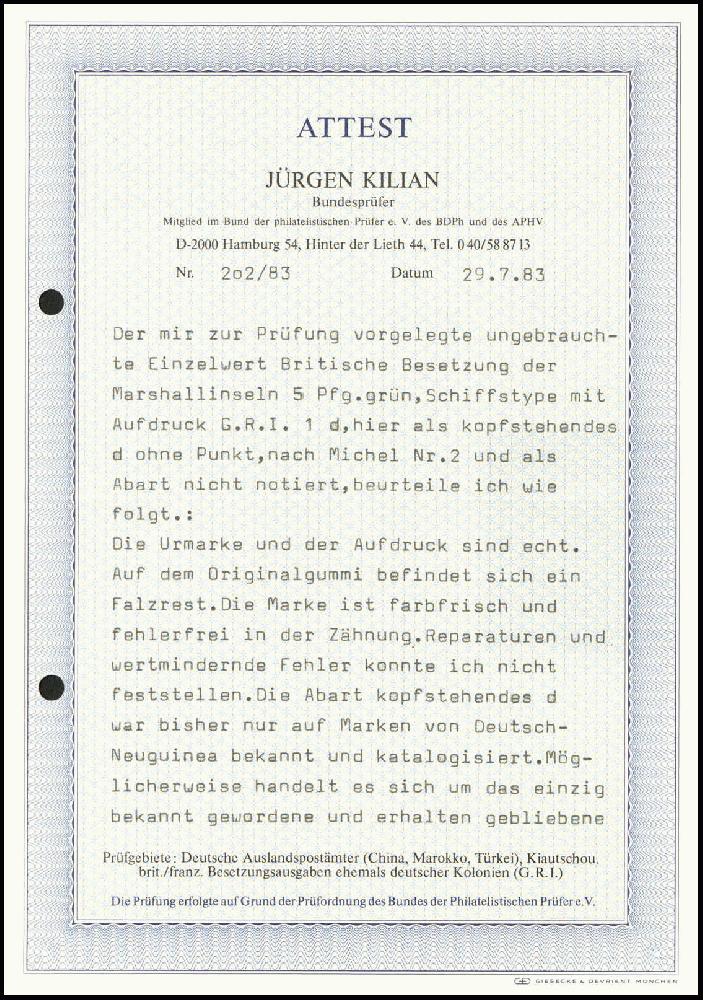 | Prüfgebiet: | Deutsche Kolonien Marshall-Inseln Britische Besetzung |