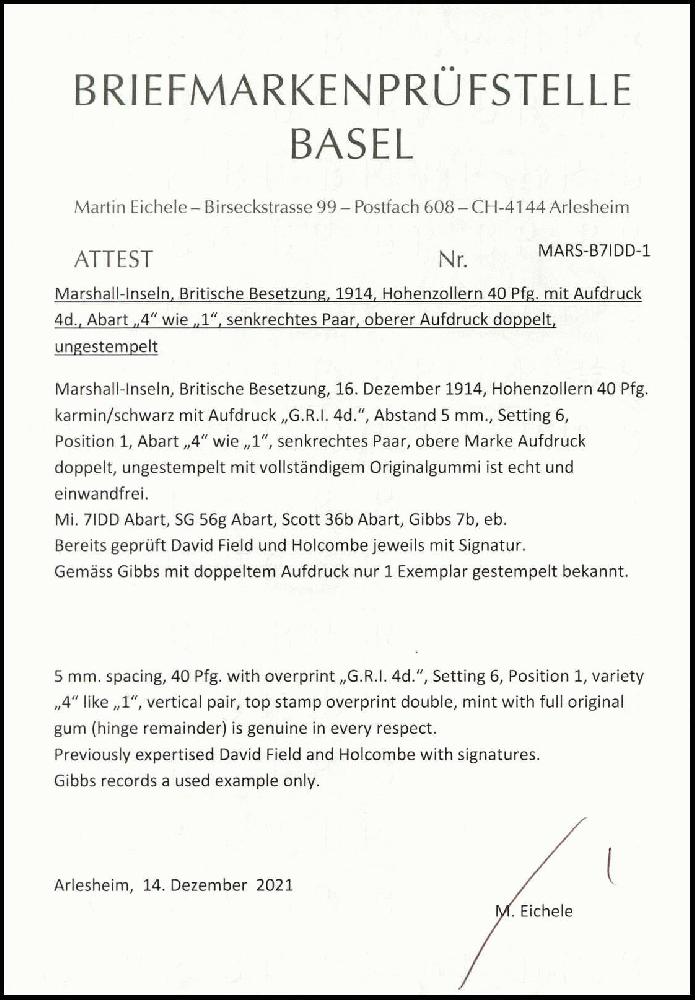 | Prüfgebiet: | Deutsche Kolonien Marshall-Inseln Britische Besetzung |