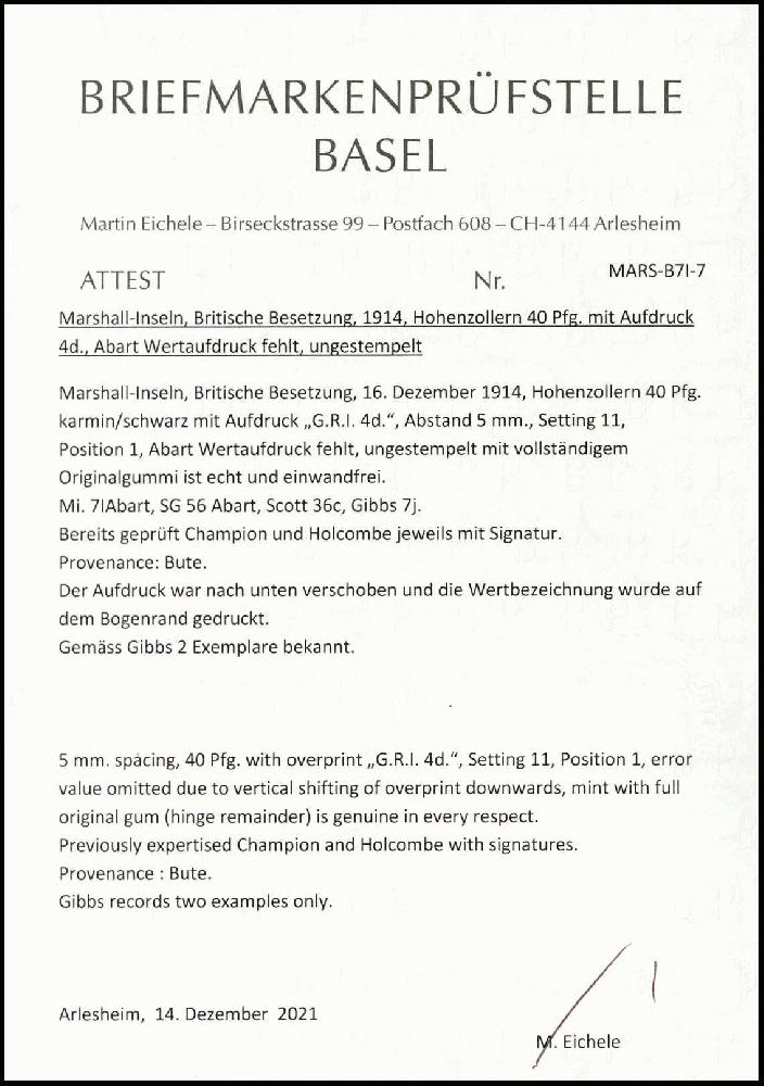 | Zusatzinformationen und Suchstichworte: | Württembergisches Auktionshaus 142. Versteigerung 23.-24. Juni 2023 Los 7438 Deutsche Kolonien Marshall Brit. Besetzung Fehlender Wertaufdruck: (4 d.) a. 40 Pfg., Abart: fehlender Wertaufdruck und "G.R.I." unten statt oben, tadelloses Exemplar in perfekter Zähnung und Zentrierung sowie mit vollem Originalgummi. Eine der markantesten Aufdruckabarten der Besetzungsausgaben. Weder bei Stanley Gibbons, noch bei Michel aufgeführt. Im Handbuch Robert Gibbs unter Nr.7j katalogisiert. Es sind bis heute ledigl. zwei Exemplare hiervon bekannt geworden, wobei vorliegendes Exemplar aus der Bute-Sammlung stammt, sign. Champion, Fotoatteste Holcombe ("A rarity"), Eichele (SG 56 Abart, Gibbs 7j) Ausruf 6.000,00 EUR |