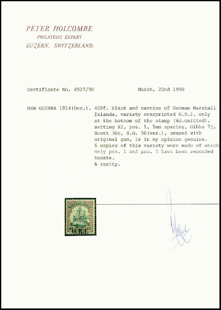 | Zusatzinformationen und Suchstichworte: | Württembergisches Auktionshaus 142. Versteigerung 23.-24. Juni 2023 Los 7438 Deutsche Kolonien Marshall Brit. Besetzung Fehlender Wertaufdruck: (4 d.) a. 40 Pfg., Abart: fehlender Wertaufdruck und "G.R.I." unten statt oben, tadelloses Exemplar in perfekter Zähnung und Zentrierung sowie mit vollem Originalgummi. Eine der markantesten Aufdruckabarten der Besetzungsausgaben. Weder bei Stanley Gibbons, noch bei Michel aufgeführt. Im Handbuch Robert Gibbs unter Nr.7j katalogisiert. Es sind bis heute ledigl. zwei Exemplare hiervon bekannt geworden, wobei vorliegendes Exemplar aus der Bute-Sammlung stammt, sign. Champion, Fotoatteste Holcombe ("A rarity"), Eichele (SG 56 Abart, Gibbs 7j) Ausruf 6.000,00 EUR |