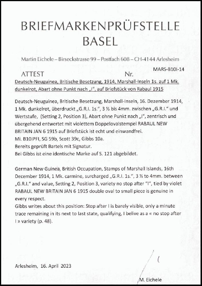 | Prüfgebiet: | Deutsche Kolonien Marshall-Inseln Britische Besetzung |