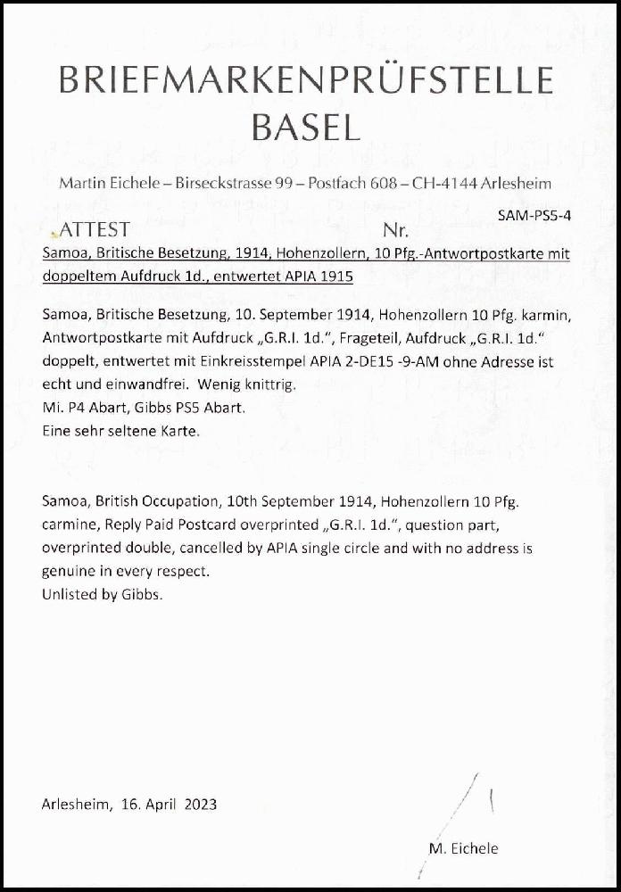 | Zusatzinformationen und Suchstichworte: | Württembergisches Auktionshaus 142. Versteigerung 23.-24. Juni 2023 Los 7535 Deutsche Kolonien Samoa Brit. Besetzung Doppelaufdruck auf 10-Pfg.-Ganzsache: 1 d. a. 10 Pfg., Frageteil von Doppelkarte mit deutlichem Doppelaufdruck und Blanko-Abstempelung APIA 2/12 15. Abgesehen von einer leichten senkr. Knitterspur in tadelloser Erhaltung. Dies ist die einzige bekannte Ganzsachenkarte Samoas mit dem doppelten Besetzungs-Aufdruck, ansonsten sind ledigl. die Freimarken bis zur 3 Shilling mit Doppelaufdrucken bekannt, Fotoatteste RPS NZ, Eichele Zuschlag 2.550,00 EUR |