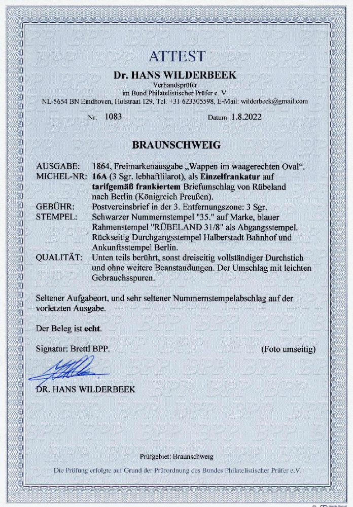 | Zusatzinformationen und Suchstichworte: | 32. Schlegel Auktionshaus Auktion 15. - 19. Mai 2023 Los 5175 Altdeutschland Braunschweig 1864, 3 Sgr. lebhaftlilarot mit bogenförmigem Durchstich 16 als Einzelfrankatur auf tarifgemäß frankiertem Briefumschlag von Rübeland nach Berlin, mit schwarzem Nummernstempel "35." auf Marke. Die Marke unten teils berührt, sonst dreiseitig vollständiger Durchstich und ohne weitere Beanstandungen. Der Umschlag mit leichten Gebrauchsspuren. Seltener Aufgabeort und sehr seltener Nummernstempelabschlag auf der vorletzten Ausgabe. Sign. Brettl BPP sowie Fotoattest Dr. Wilderbeek BPP 08/2022 Zuschlag 324,00 EUR |