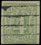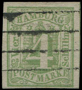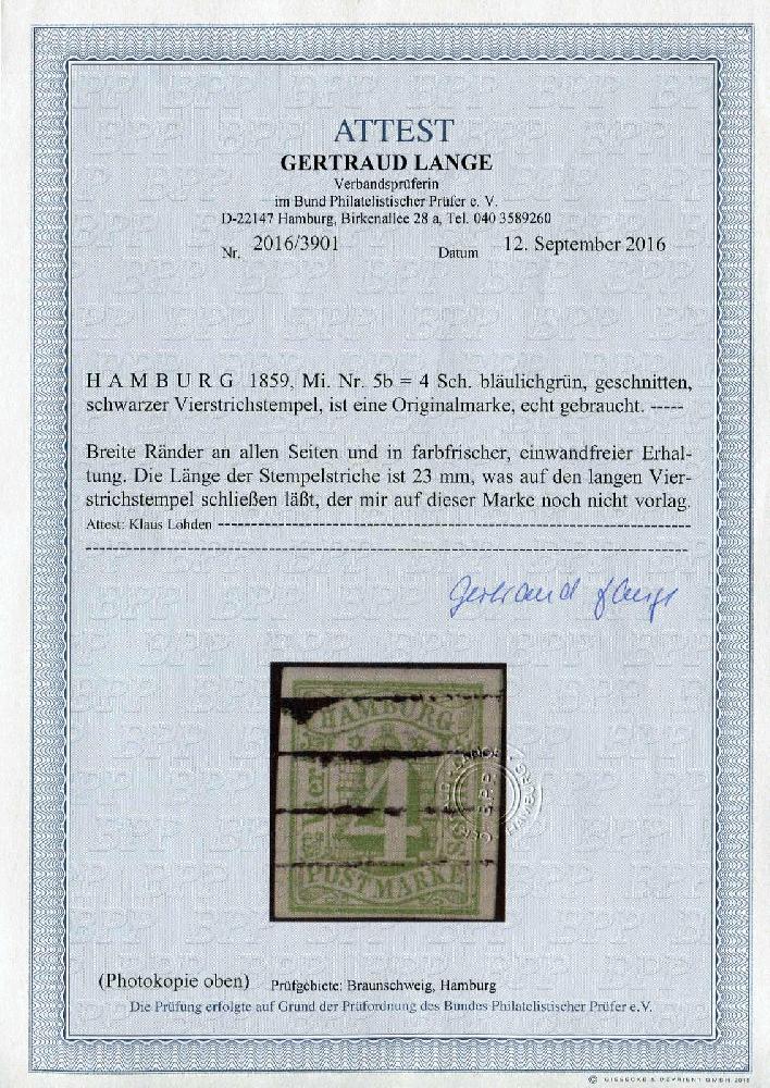 | Zusatzinformationen und Suchstichworte: | 32. Schlegel Auktionshaus Auktion 15. - 19. Mai 2023 Los 5184 Altdeutschland Hamburg 1859, 4 S. Wappen bläulichgrün, gestempelt mit dem auf dieser Marke sehr seltenem langen schwarzen Vierstrichstempel, allseits breitrandig, rechts mit kompletter Randlinie, farbfrisch in einwandfreier Qualität, lt. Attest von 2016 lag der Stempel auf dieser Marke bis dahon kein zweites Mal vor, Fotoattest Lange BPP (ME 1.800,-++) Zuschlag 800,00 EUR |