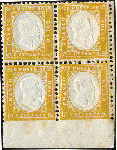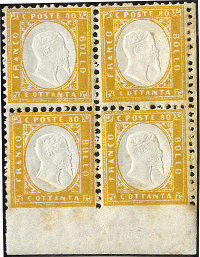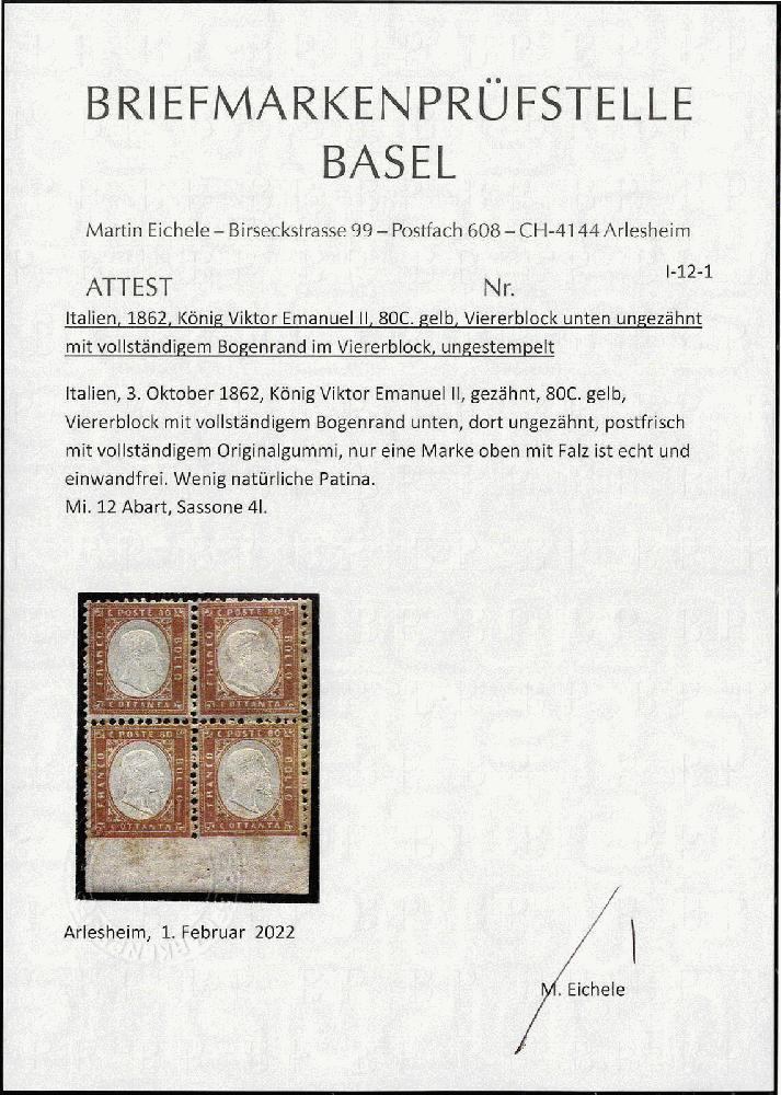 | Zusatzinformationen und Suchstichworte: | Götz 402. Auktion 19. - 23. Juni 2023 Los 2555 Italien 80 C. gelb, 4er-Block vom Unterrand, dort beide Marken unten ungezähnt, ** bzw. rechte obere Marke ungebraucht mit natürlicher leichter Patina in soweit einwandfreier Erhaltung. Mi. nicht katalogisiert. Farbfotoattest Eichele Ausruf 100,00 EUR |