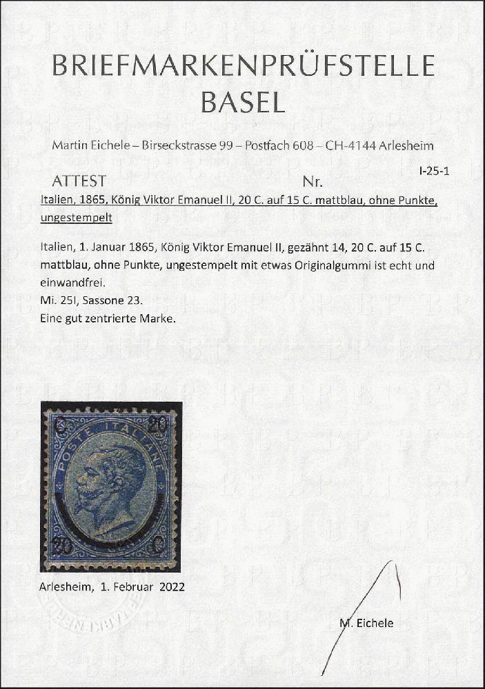 | Zusatzinformationen und Suchstichworte: | Götz 402. Auktion 19. - 23. Juni 2023 Los 2561 Italien 20 a. 15 C. blau in Type I, ungebraucht mit grossen Teilen des Originalgummis. Gemäss Farbfotoattest Eichele eine gut zentrierte Marke. Mi. 1.600,- € Ausruf 150,00 EUR |